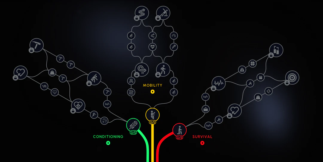 A Raider is more than just their gear. You can also invest experience into a skill tree with three distinct specializations: Conditioning, Survival, and Mobility. Allocate points between branches in skill tree at your discretion, to create your unique build.